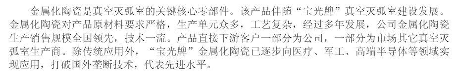 “宝光”牌系列产品包括真空灭弧室、固封极柱、电真空陶瓷、太阳能集热管、以操动机构为核心的电气配套产品等,其主营真空灭弧室参数覆盖范围广,技术先进,品质卓越。宝光股份已发展成为享誉国内外的真空灭弧室产销基地,市场占有率长期稳定在30%以上,连续多年稳居行业前列。“宝光牌”真空灭弧室曾荣获国家科技进步奖特等奖1项、二等奖1项等诸多奖项。此外,公司还在储能、氢能领域进行了业务布局。